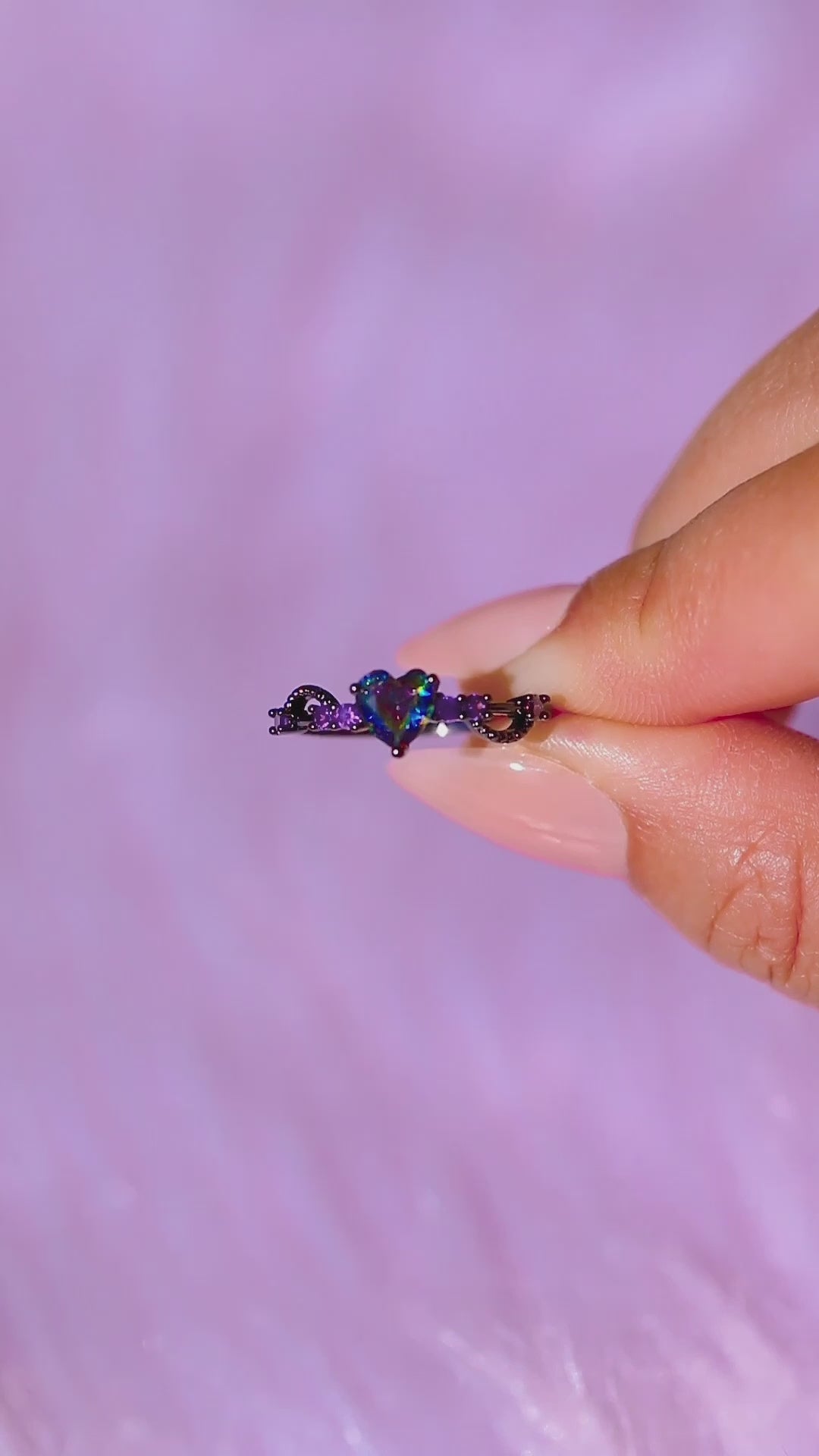 - Design: Mystic topaz heart crystal with purple side crystals