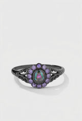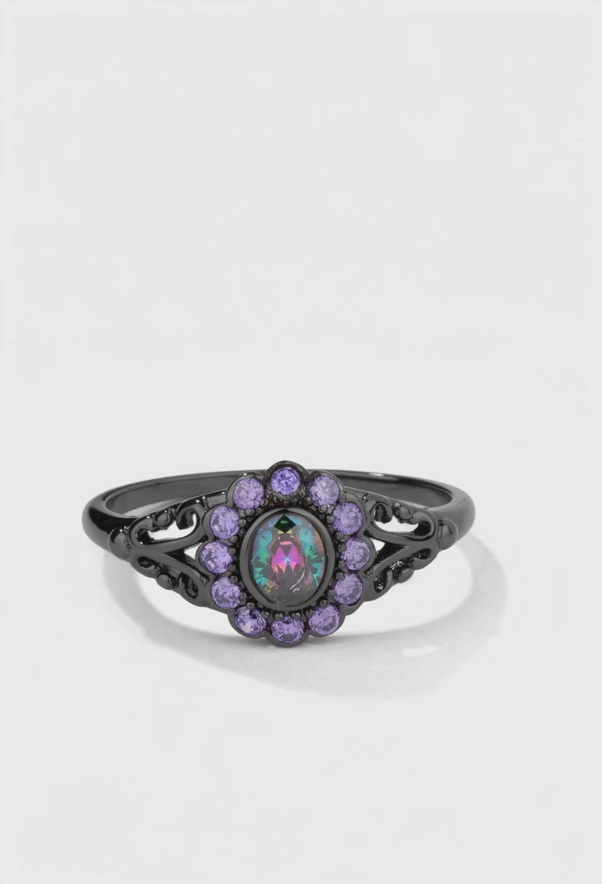 - Design: Mystic topaz bezel stone on a chunky vintage band with bezel halo