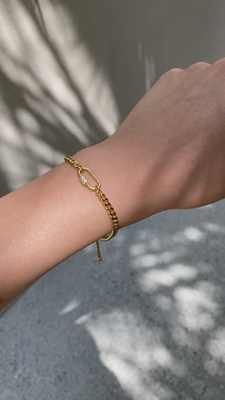 - Design: Carabiner hardware charm with white crystals on a curb chain