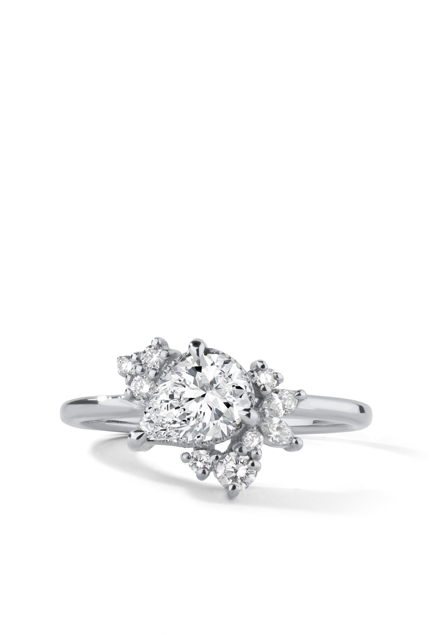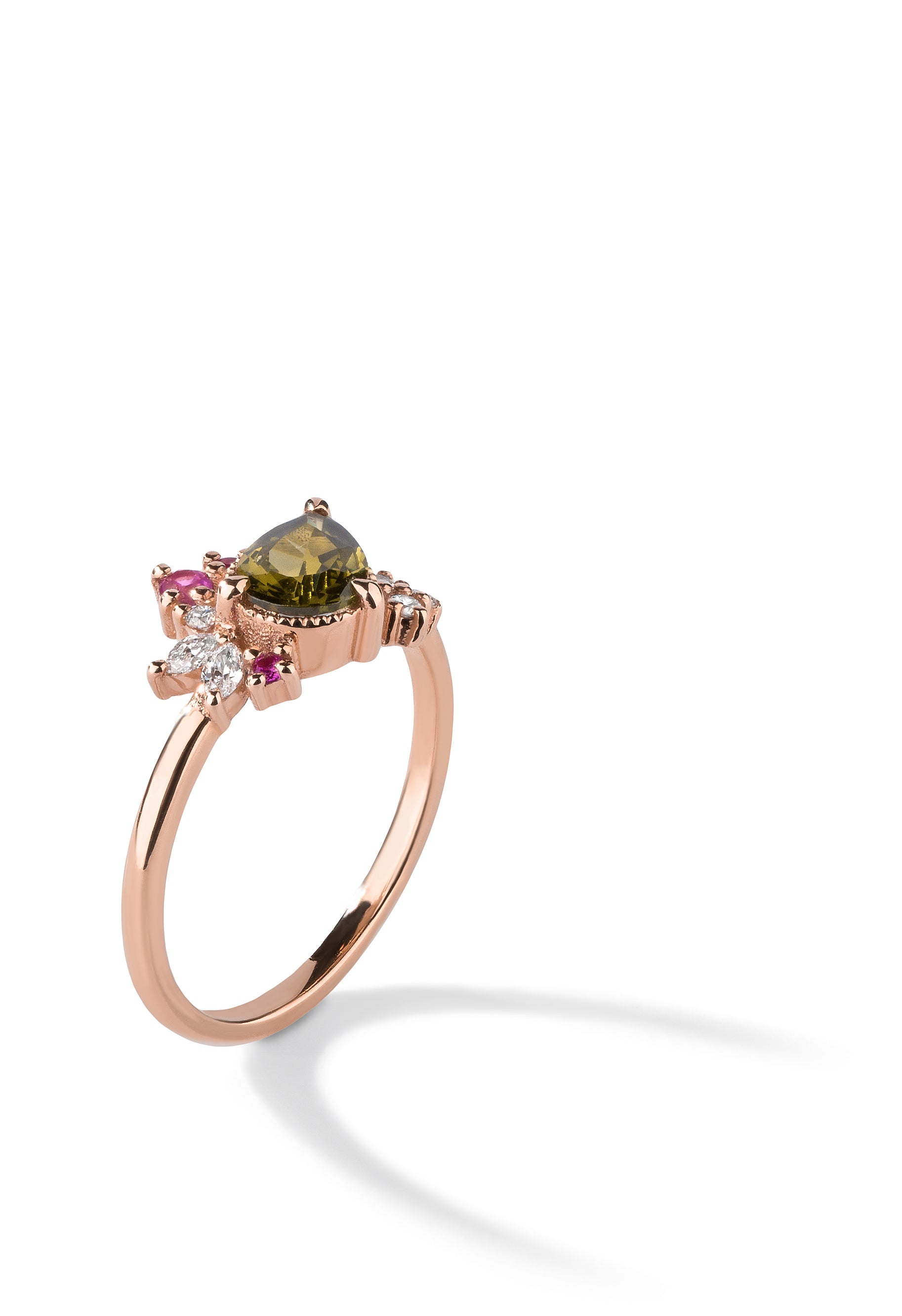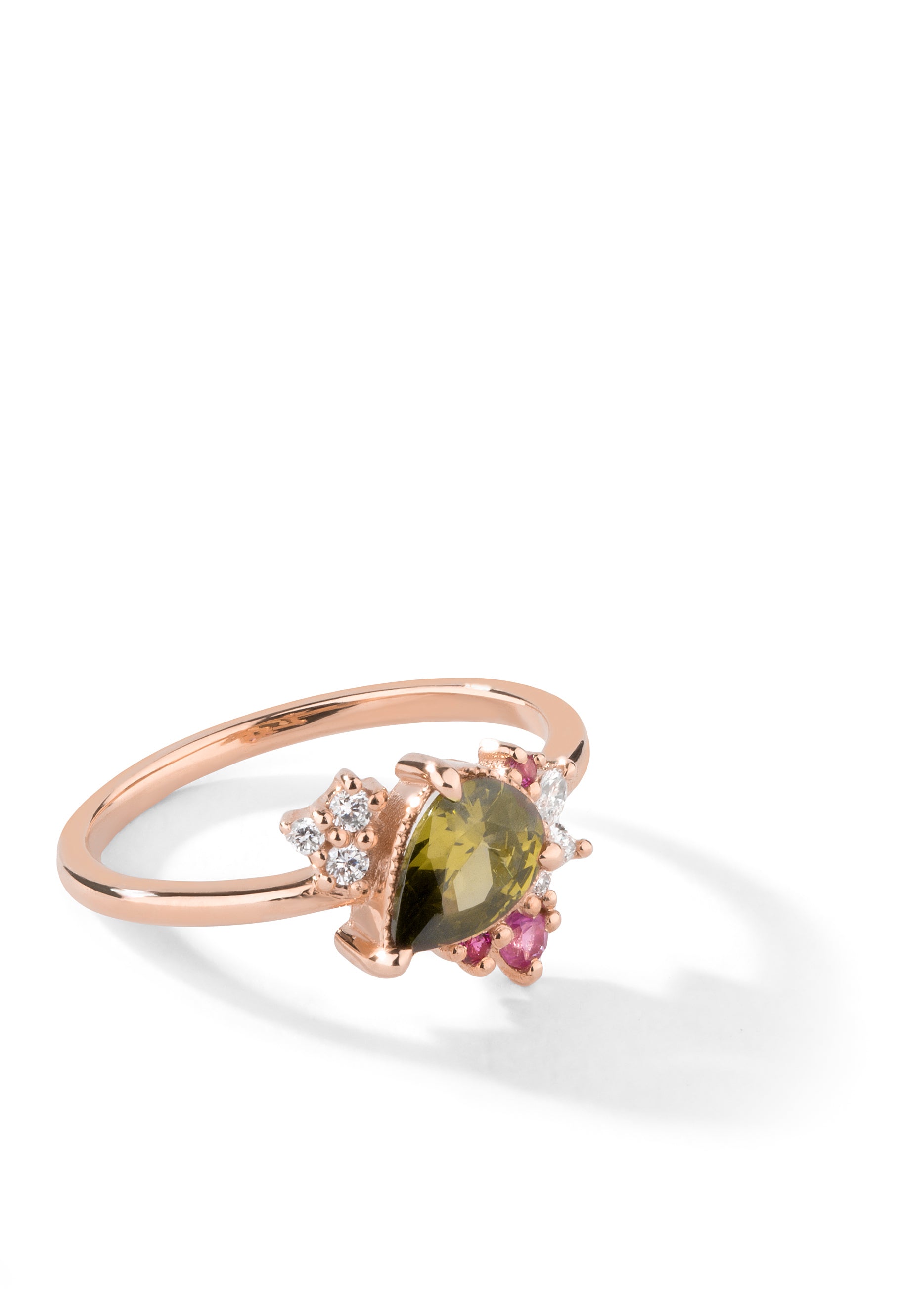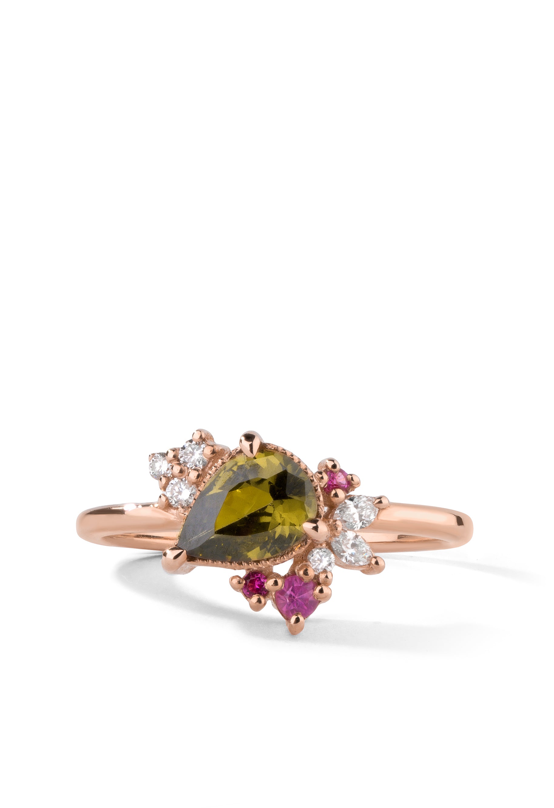 - Design: Pear cut center stone + .13ct round diamonds + .18ct marquise diamonds + .09ct pink tourmaline